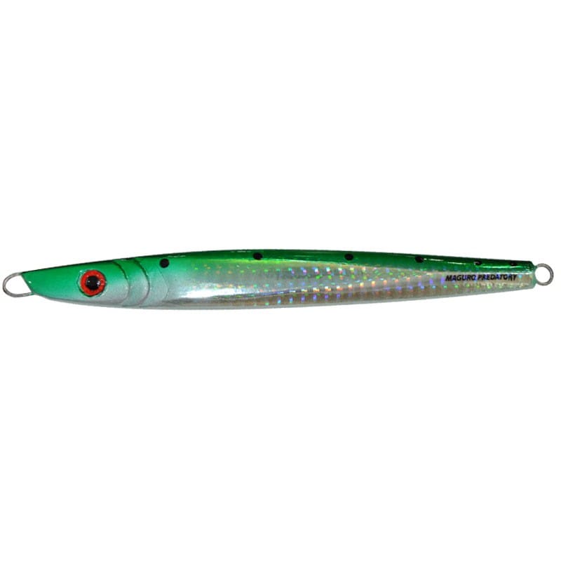 Centre weight, flat-spoon profile jig with flashy holographic side & GID (Glow In the Dark) belly. Targeting the biggest individual of the school, this jig flutter constantly with slow action, staying at & prospecting the strike zone longer.